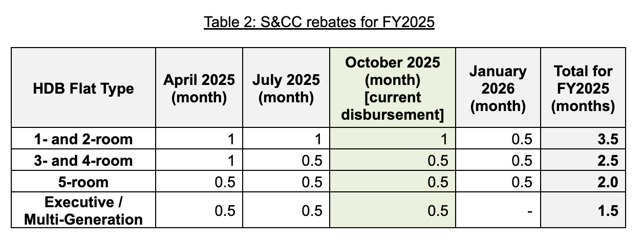 3. Eligible households will also receive up to 1 month of S&CC rebates in October, depending on their HDB flat type. In total, eligible households will receive up to 3.5 months of S&CC rebates in FY2025. The S&CC rebates that eligible households will receive are summarised in Table 2.