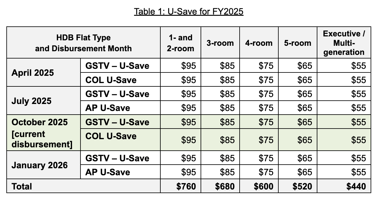 30 Sep 2025More than 950,000 Singaporean households living in HDB flats will receive U-Save and Service & Conservancy Charges (S&CC) rebates in October 2025 as part of the permanent GST Voucher (GSTV) scheme and the enhanced Assurance Package. These rebates help to offset utilities expenses and S&CC for lower- to middle-income HDB households. They are disbursed in April, July, October, and January each year. The rebates in October 2025 will be the third quarterly disbursement for Financial Year (FY) 2025.